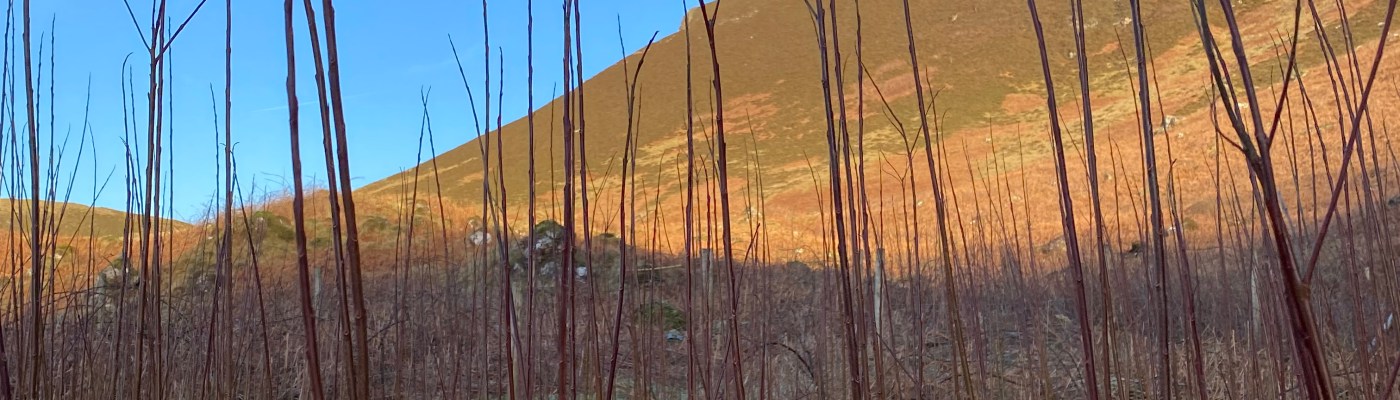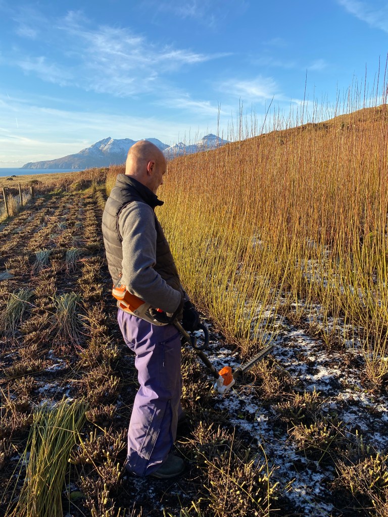 It’s a cold but sunny January day – there’s snow on the peaks of the Isle of Rum across the sea. We are on Catherine and Pascal’s croft, under the cliffs on the North side of Eigg, and it’s time for the willow harvest.
