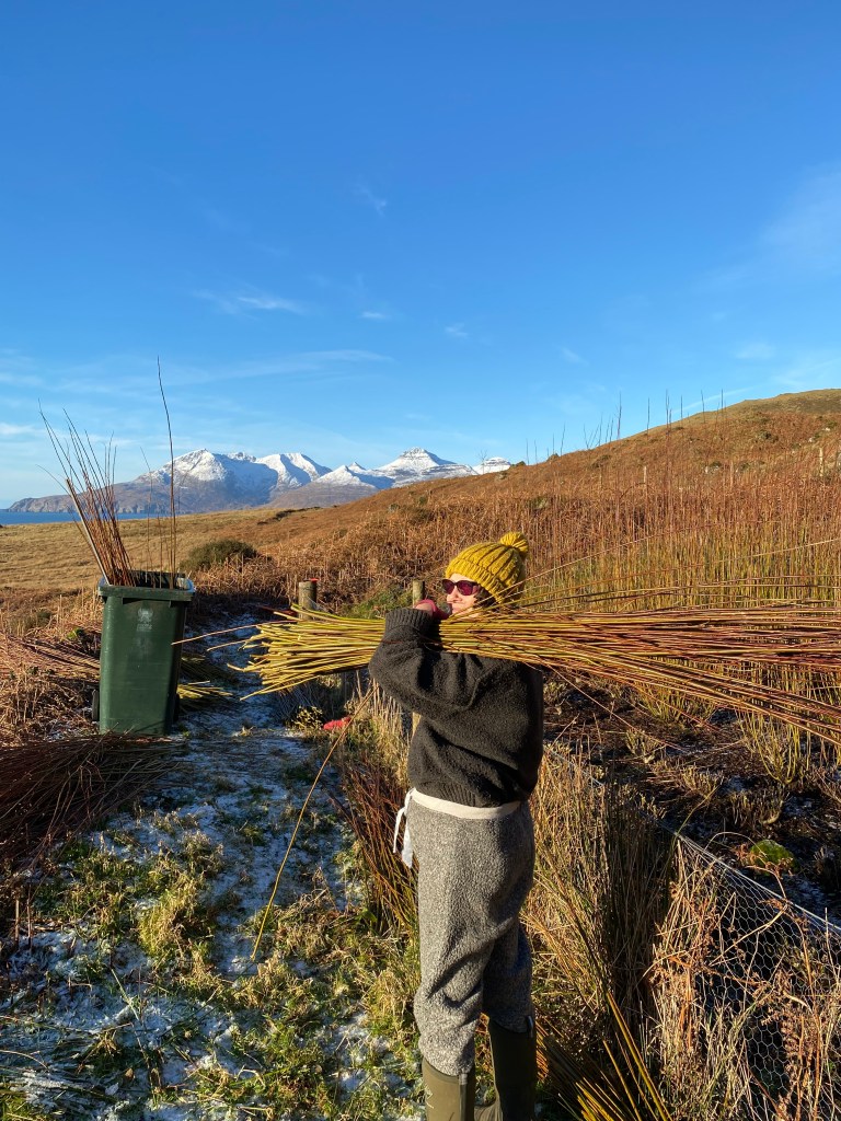 Willow is an incredible plant and there’s so many different varieties. On their croft, they grow around 20 varieties – some for fine basketry, while others are thicker, for hurdles or traditional work baskets. Some is reddish brown when it dries, some green and some gold.