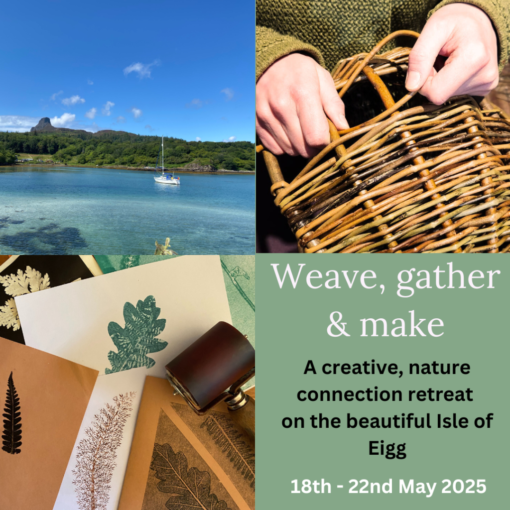 Join Laurie King and basket makers from All About Willow, Catherine Davies and Pascal Carr, for a creative retreat on the beautiful Isle of Eigg. This retreat offers practical ways to connect with nature through willow weaving, gathering and botanical printmaking, alongside mindfulness and foraging walks.