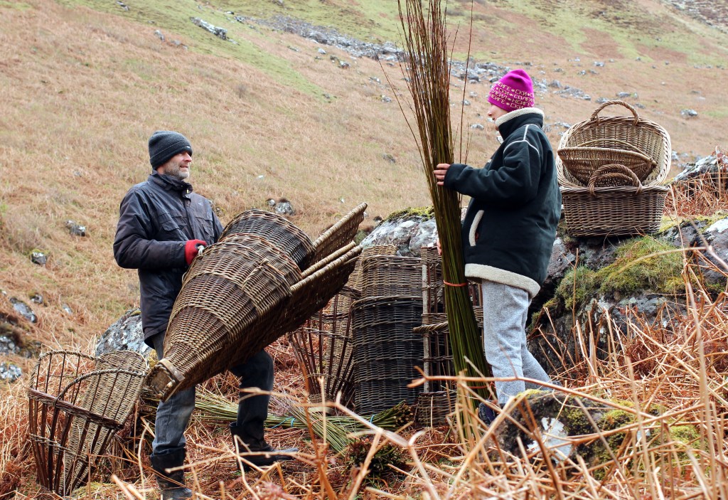Catherine Davies and Pascal Carr are basket makers who live and work on the Isle of Eigg. Their willow baskets are hand made with different coloured varieties of willow grown organically on their croft.